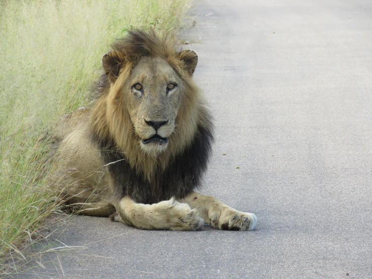 A few kilometers short of Lower Sabie a small gaggle of cars alerted me to a sighting. This time two big lions on the road. Great view. Breakfast was at the picnic spot Nkuhlu. A pleasant spot on the river and joined by a few others.